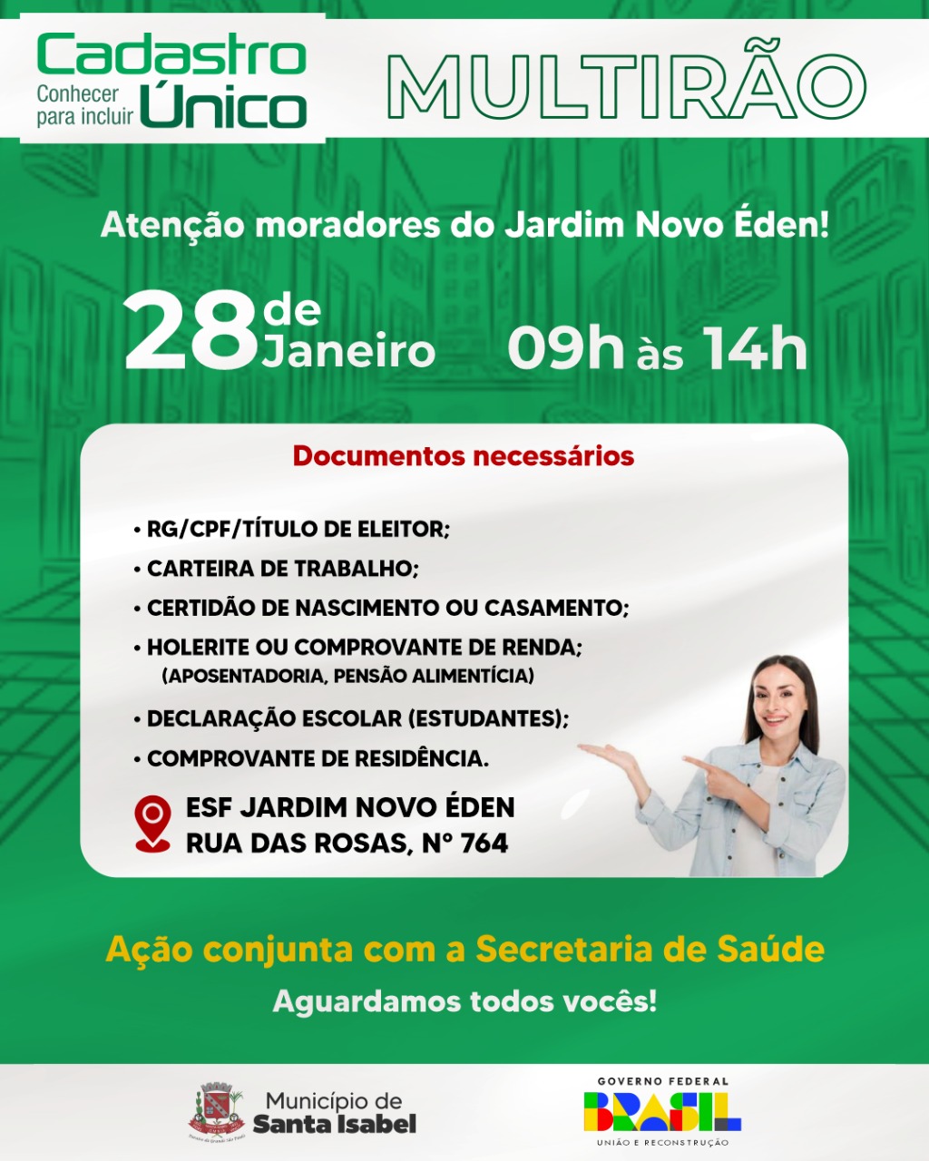 Com objetivo de expandir o acesso dos munícipes aos benefícios sociais do Cadastro Único (CADÚnico), neste sábado (28/01), será realizado um mutirão para atualizações, inclusões e consultas no sistema. A ação ocorrerá das 9h às 14h, na ESF Jardim Novo Éden, localizada na Rua das Rosas, N° 764. No momento do atendimento é necessário apresentar os seguintes documentos originais, de todos os residentes na casa: