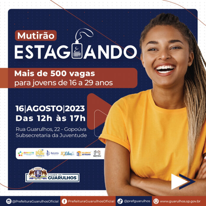 No dia 16 de agosto, das 12h às 17h, a Prefeitura de Guarulhos promove o Mutirão Estagiando, direcionado a jovens com idade entre 16 e 29 anos. O evento acontece na sede da Subsecretaria da Juventude, na rua Guarulhos, 22, Gopoúva. Para participar é necessário cursar o ensino médio, técnico ou superior, levar currículo impresso e documento pessoal com foto.