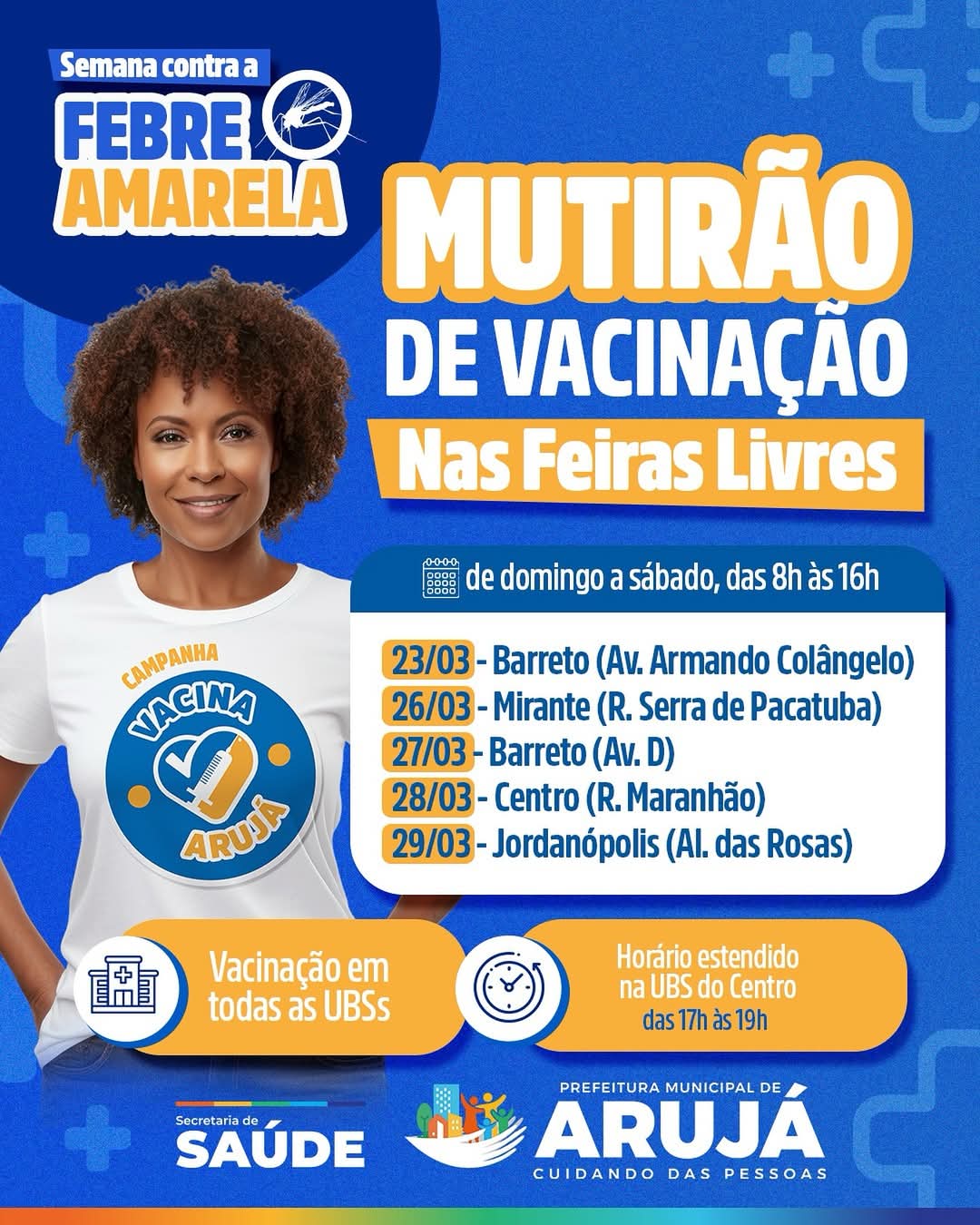 A Prefeitura de Arujá, por meio da Secretaria Municipal de Saúde, lança uma iniciativa inovadora para proteger a população contra a febre amarela: um mutirão de vacinação nas feiras livres da cidade. A ação visa alcançar um grande número de pessoas e garantir que elas estejam protegidas contra essa doença grave, mas prevenível.