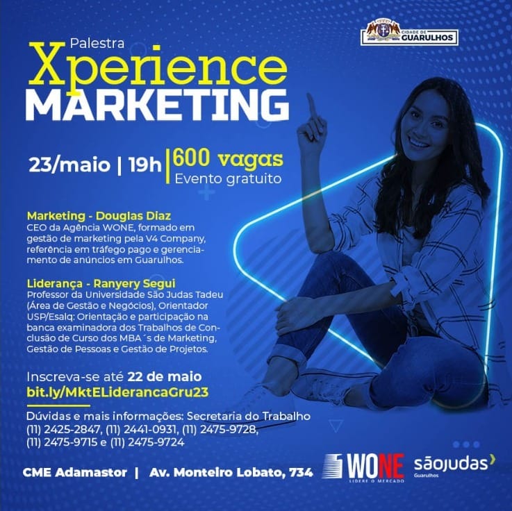 Ainda restam vagas para a palestra Xperience Marketing 2023 – Marketing e Liderança, que acontecerá na próxima terça-feira (23), às 19h, gratuitamente no Adamastor. Os interessados têm até segunda-feira (22) para se inscrever pelo link https://forms.gle/rDUtzxmPYgeCEEHz5.