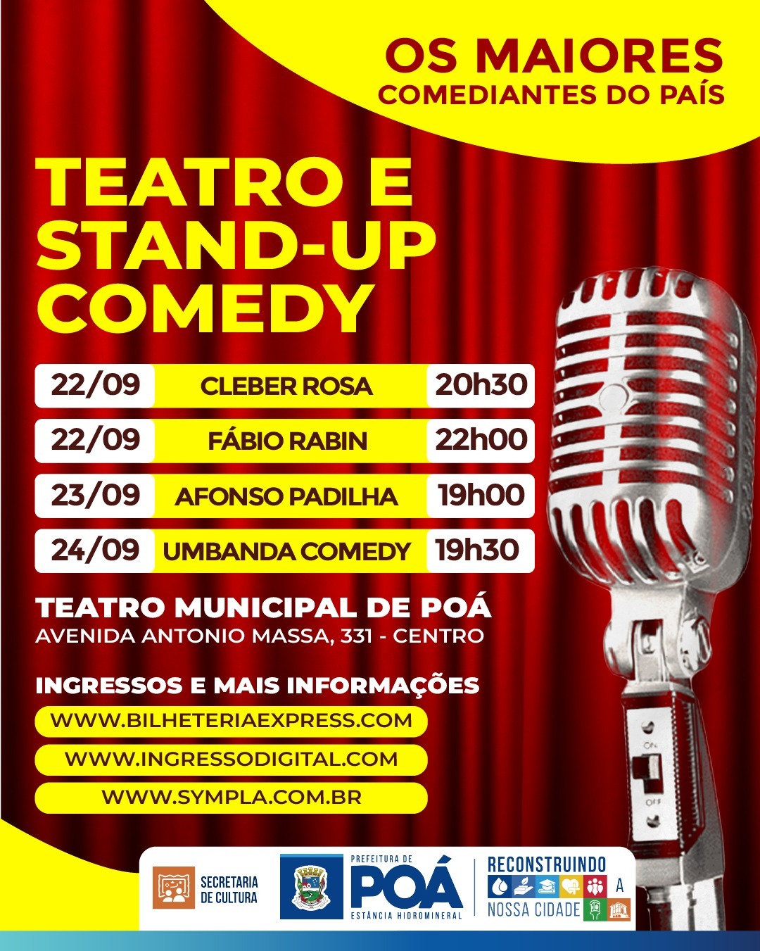 A partir de sexta-feira, dia 22/09, Poá receberá shows de stand up no Teatro Municipal. Os ingressos podem ser adquiridos nos sites bilheteriaexpress.com; ingressodigital.com, e sympla.com.br. A programação se encerra no domingo.