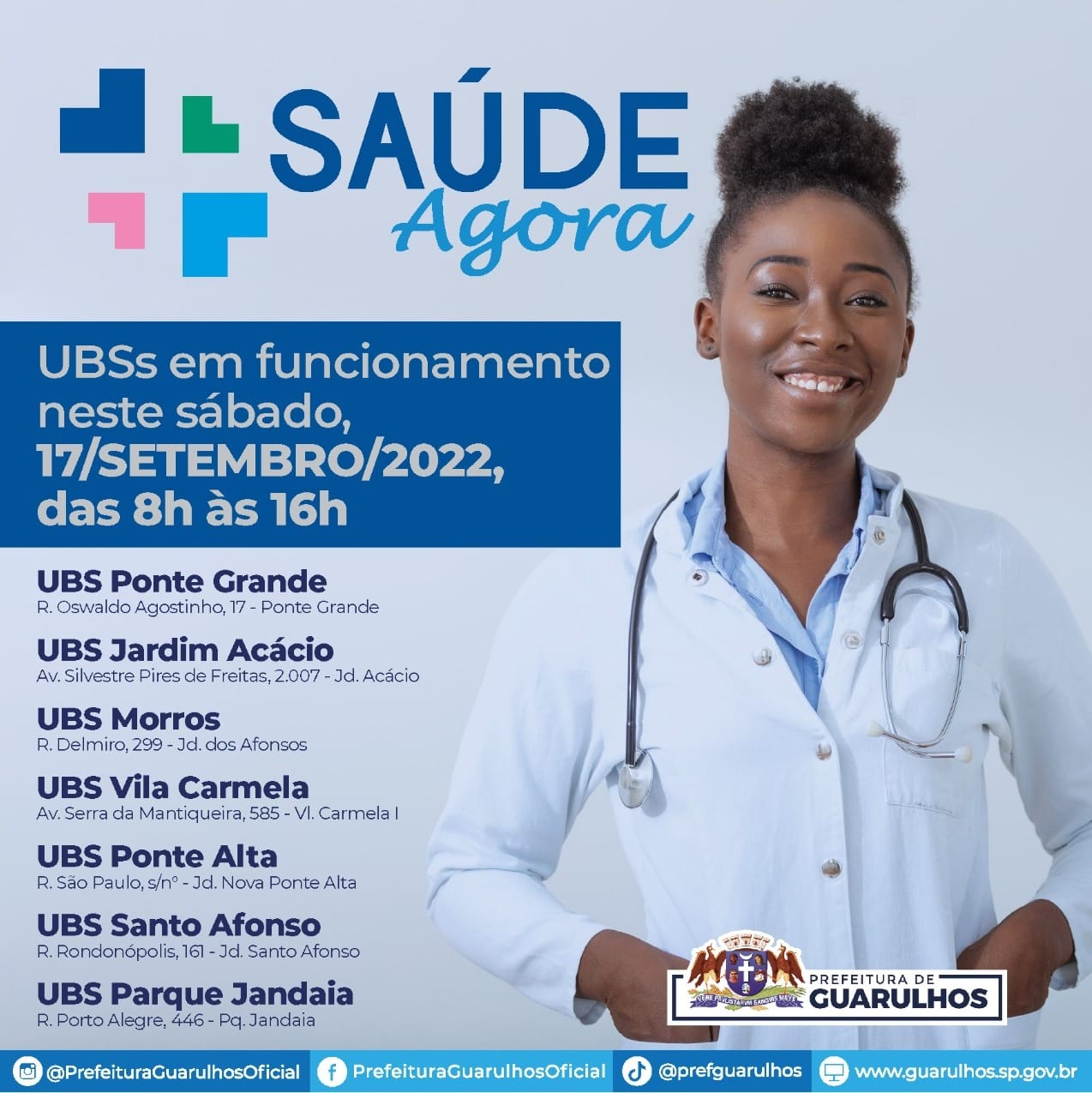 Neste sábado (17) a Prefeitura de Guarulhos abrirá sete Unidades Básicas de Saúde (UBS) pelo programa Saúde Agora. As UBS Ponte Grande, Jardim Acácio, Morros, Vila Carmela, Ponte Alta, Santo Afonso e Parque Jandaia estarão abertas das 8h às 16h para prestar atendimento à população.