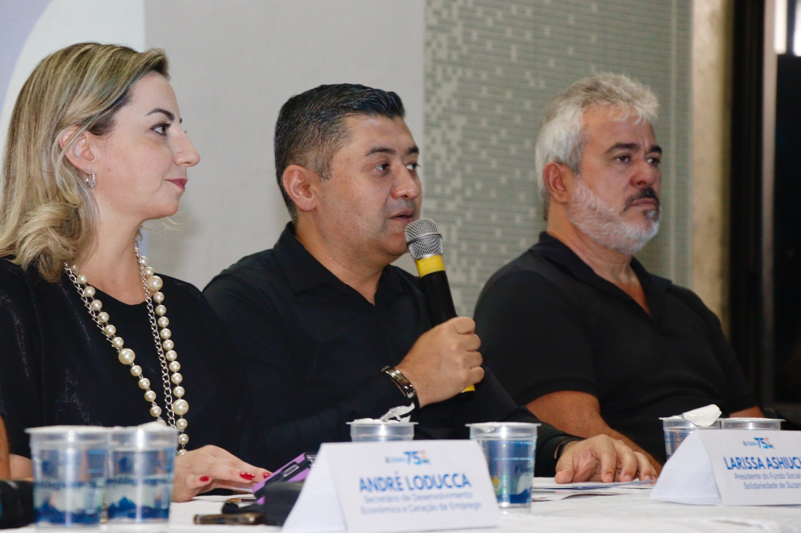 O prefeito Rodrigo Ashiuchi anunciou os detalhes de cada etapa das comemorações à imprensa, nesta sexta-feira (01/03), em evento no Cineteatro Wilma Bentivegna, que contou com a participação da presidente do Fundo Social de Solidariedade, a primeira-dama Larissa Ashiuchi; do presidente da empresa MP Promoções, responsável pela realização do “Suzano Fest”, Marcos Pacheco; da secretária de Cultura, Márcia Belarmino; do secretário de Desenvolvimento Econômico e Geração de Emprego, André Loducca; do secretário de Educação, Leandro Bassini; do secretário de Segurança Cidadã, Afrânio Evaristo da Silva; do secretário de Comunicação Pública, Paulo Pavione; do diretor da Secretaria Municipal de Cultura, José Spitti; da gestora estratégica da Educação, Renata Priscila; e do diretor da pasta do Desenvolvimento Econômico, Marcos Manrique.