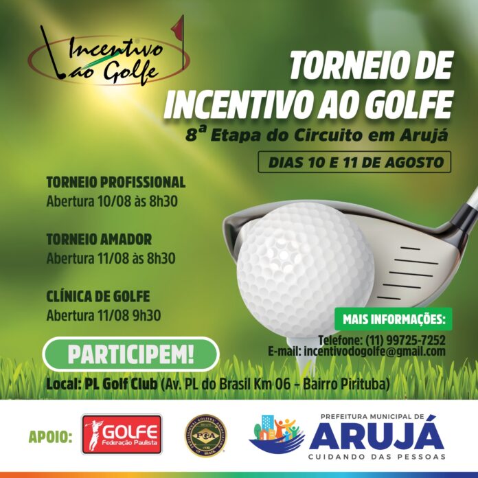 A Prefeitura de Arujá apoiará, nos dias 10 e 11 de agosto, o Torneio Incentivo ao Golfe, como parte da programação da 8ª Etapa Tour 2023, ainda em comemoração aos 64 anos de emancipação política da Cidade. O organizador Ivanildo de Lima, mais conhecido como Makacheira, afirma que o campeonato terá as Categorias Aspirante, Amador e Profissional e que haverá premiação em troféus e em dinheiro. “Para as três primeiras categorias de Aspirante e Amador, os prêmios serão troféus, enquanto que para a categoria Profissional, que só será possível pelo apoio que está sendo dado pela atual administração municipal, serão R$ 36 mil em dinheiro, distribuídos para os primeiros 15 colocados, com R$ 5 mil para o 1° lugar, R$ 3,5 mil para o 2° e R$ 2,9 mil para o 3° lugar”, pontuou ele.