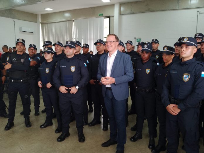 Na manhã desta segunda-feira (11), o Parque dos Ipês sediou mais um importante evento. Trata-se da apresentação de 24 novos integrantes da Guarda Civil Municipal (GCM) de Arujá, o que representa um aumento de 50% no número do efetivo da corporação, pois o 25º homem chegará em breve. A cerimônia ocorreu com a presença do prefeito Luis Camargo, o Dr Camargo, acompanhado do vice-prefeito, Betinho, do secretário municipal de Segurança Pública, Washington Adami, seu adjunto, o GCM Silva, do comandante da GCM arujaense, Oliveira, e secretários municipais e vereadores.