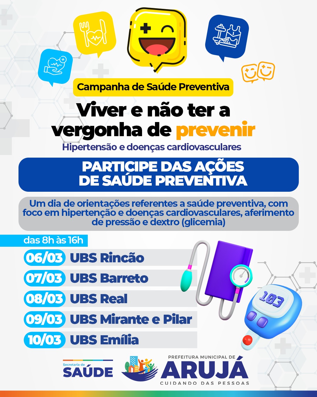 A Prefeitura de Arujá dará início ao mês de prevenção às doenças cardiovasculares e hipertensão. As equipes da Secretaria Municipal de Saúde realizarão, nesta primeira ação, uma semana de orientação e aferição de pressão arterial e dextro (medição de glicose) nas Unidades Básicas de Saúde (UBSs) do município, das 8 às 16 horas. A campanha de saúde preventiva “Viver e não ter a vergonha de prevenir” visa cuidar não só da saúde, mas do bem-estar dos arujaenses.