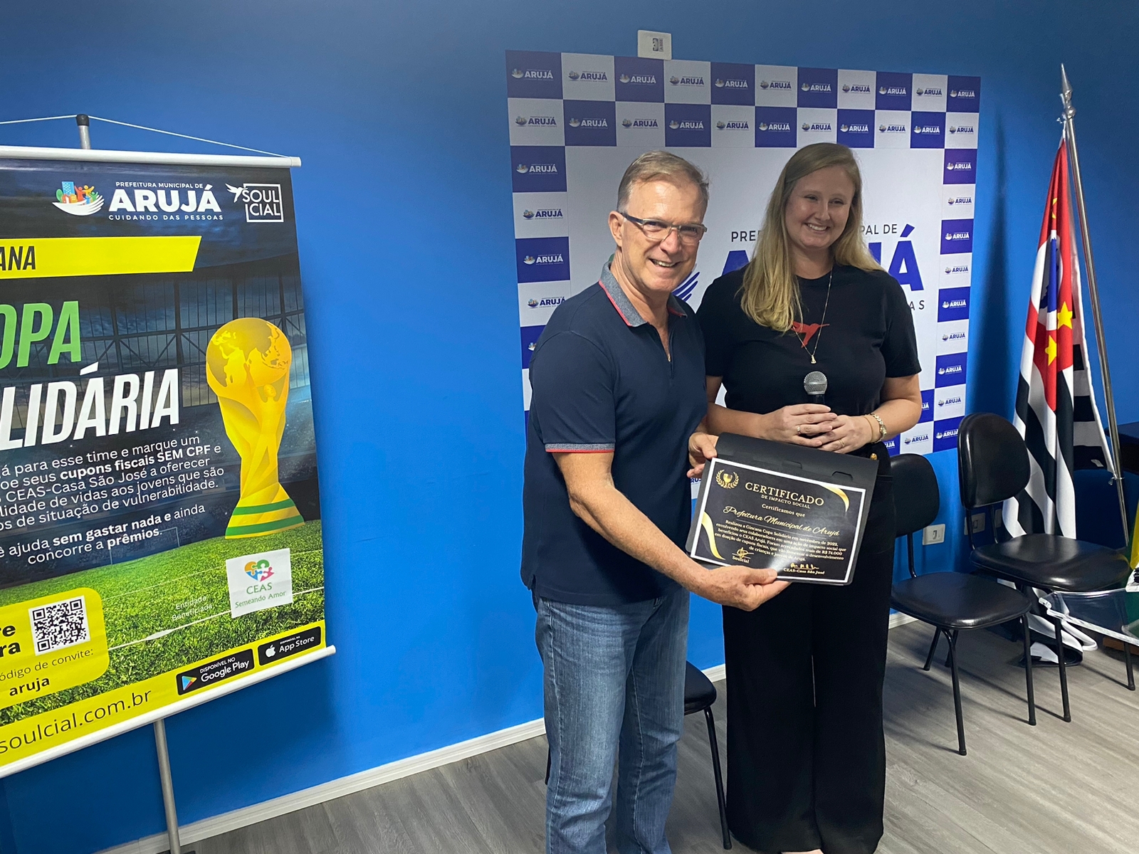 Na tarde desta quinta-feira (19), na Sala de Reuniões da Prefeitura, foram premiados com certificados e troféus para os primeiros colocados os 20 servidores municipais, de diversos setores e secretarias, que mais arrecadaram, ao doarem cupons fiscais sem CPF, valores destinados à Casa São José (CEAS) de Arujá para suas obras assistenciais. O evento, em parceria com a startup Soulcial, foi chamado de Gincana Copa Solidária, por ter sido realizado de 1° de novembro a 18 de dezembro de 2022, paralelamente à Copa do Mundo.