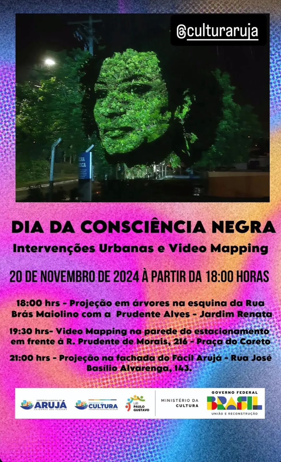 Celebre conosco o Dia da Consciência Negra em Arujá! Nesta quarta-feira (20), a partir das 18h, acontecerão intervenções urbanas e video mapping em diferentes locais da cidade.