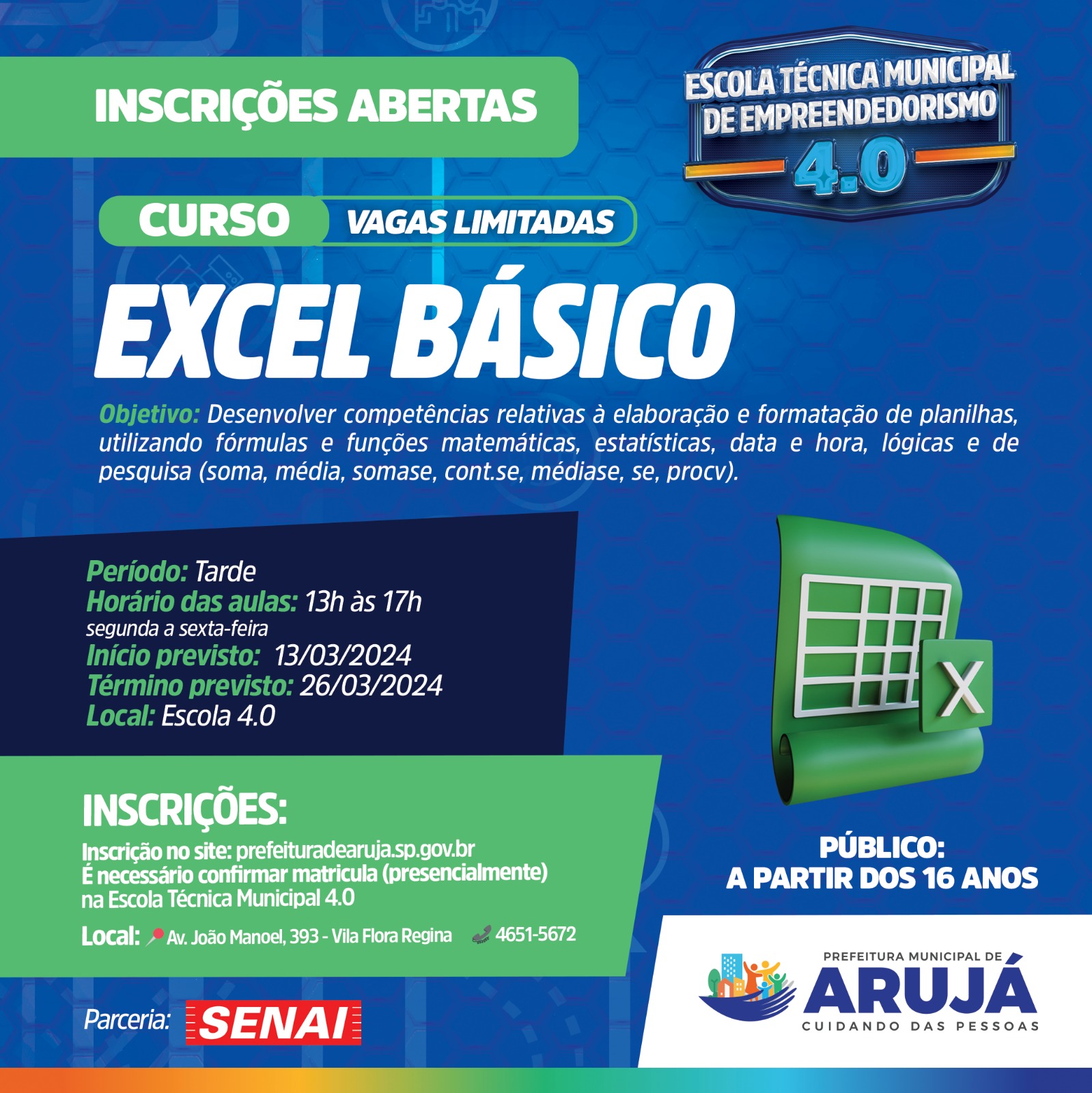 Estão abertas as inscrições para o curso gratuito de “Excel Básico” na Escola Técnica Municipal 4.0, uma inciativa da Prefeitura de Arujá, por meio da Secretaria Municipal de Desenvolvimento Econômico, em parceria com o SENAI – Serviço Nacional de Aprendizagem Industrial. As aulas acontecerão das 13h às 17h, de segunda-feira a sexta-feira, a partir do dia 13 de março, com conclusão no dia 26 de março. Serão ofertadas 20 vagas.