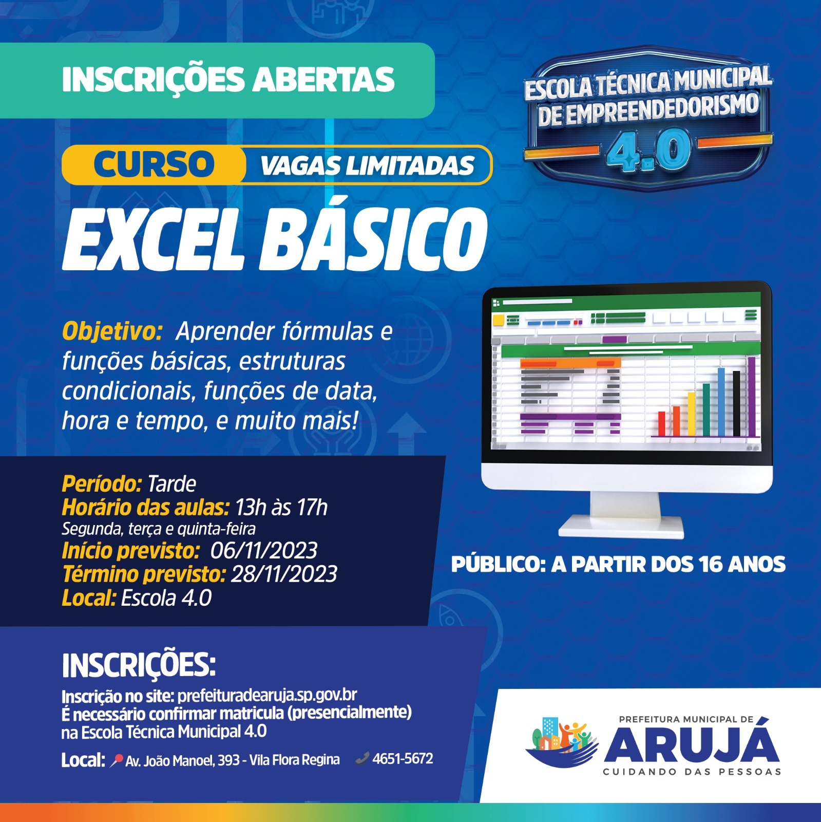 Estão abertas as inscrições para o curso gratuito de “Excel Básico” na Escola Técnica Municipal 4.0, uma inciativa da Prefeitura de Arujá, por meio da Secretaria Municipal de Desenvolvimento Econômico. As aulas acontecerão das 13h às 17h, de segunda-feira, terça-feira e quinta-feira, a partir do dia 06 de novembro. Serão ofertadas 20 vagas. Os interessados devem ser maiores de 16 anos e se cadastrar pelo site da Prefeitura (prefeituradearuja.sp.gov.br/projeto/cursos/). É necessário confirmar a matrícula presencialmente na Escola 4.0 ( Av. João Manoel 393, Vila Flora Regina).