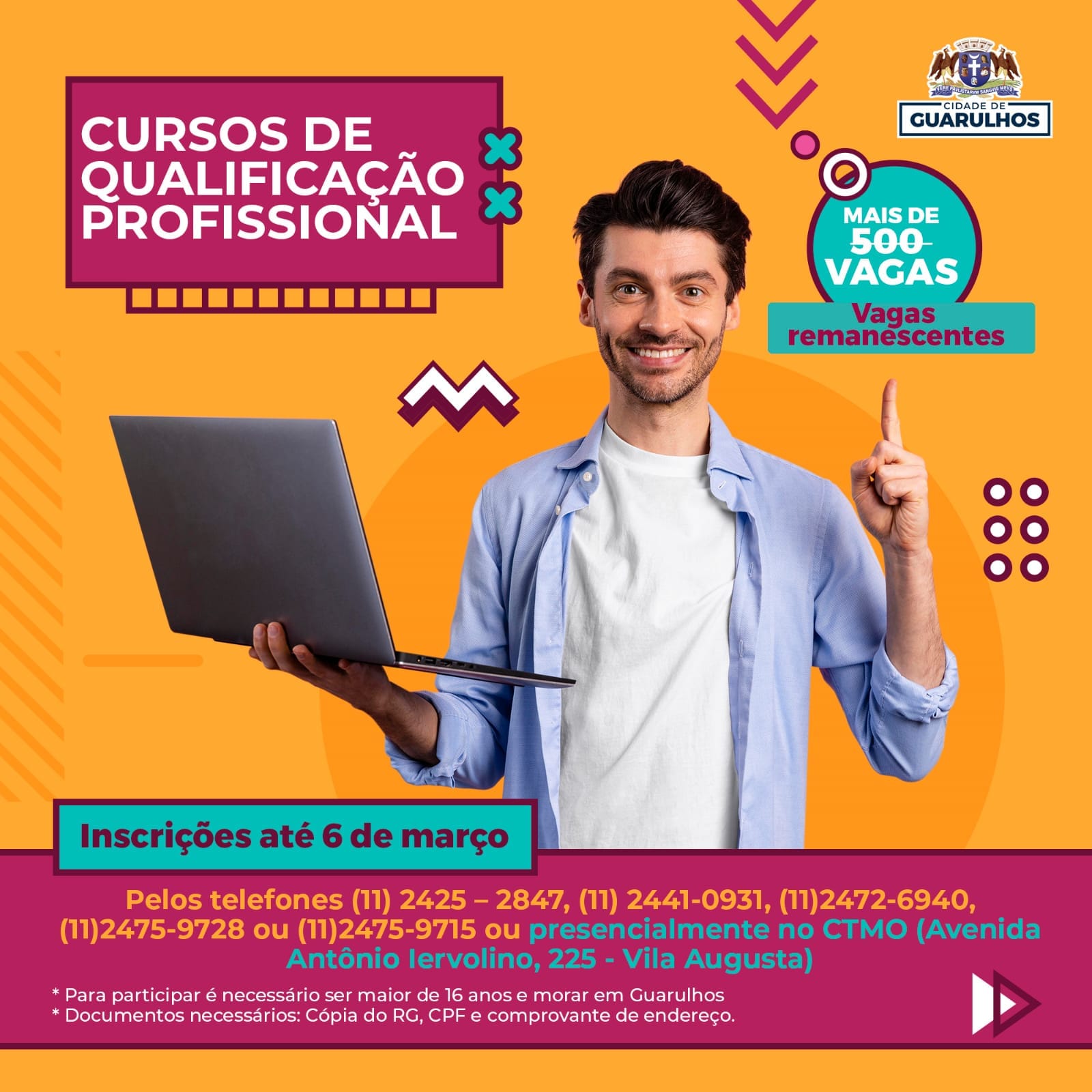 A Prefeitura de Guarulhos receberá até a próxima sexta-feira (10) as inscrições para 77 vagas remanescentes em seis cursos gratuitos de qualificação profissional. Os interessados devem entrar em contato pelos telefones (11) 2425-2847, (11) 2441-0931, (11) 2472-6940, (11) 2475-9728 ou (11) 2475-9715, da Secretaria do Trabalho, ou procurar presencialmente o Centro de Treinamento de Mão de Obra (CTMO) na avenida Antônio Iervolino, 225, Vila Augusta.