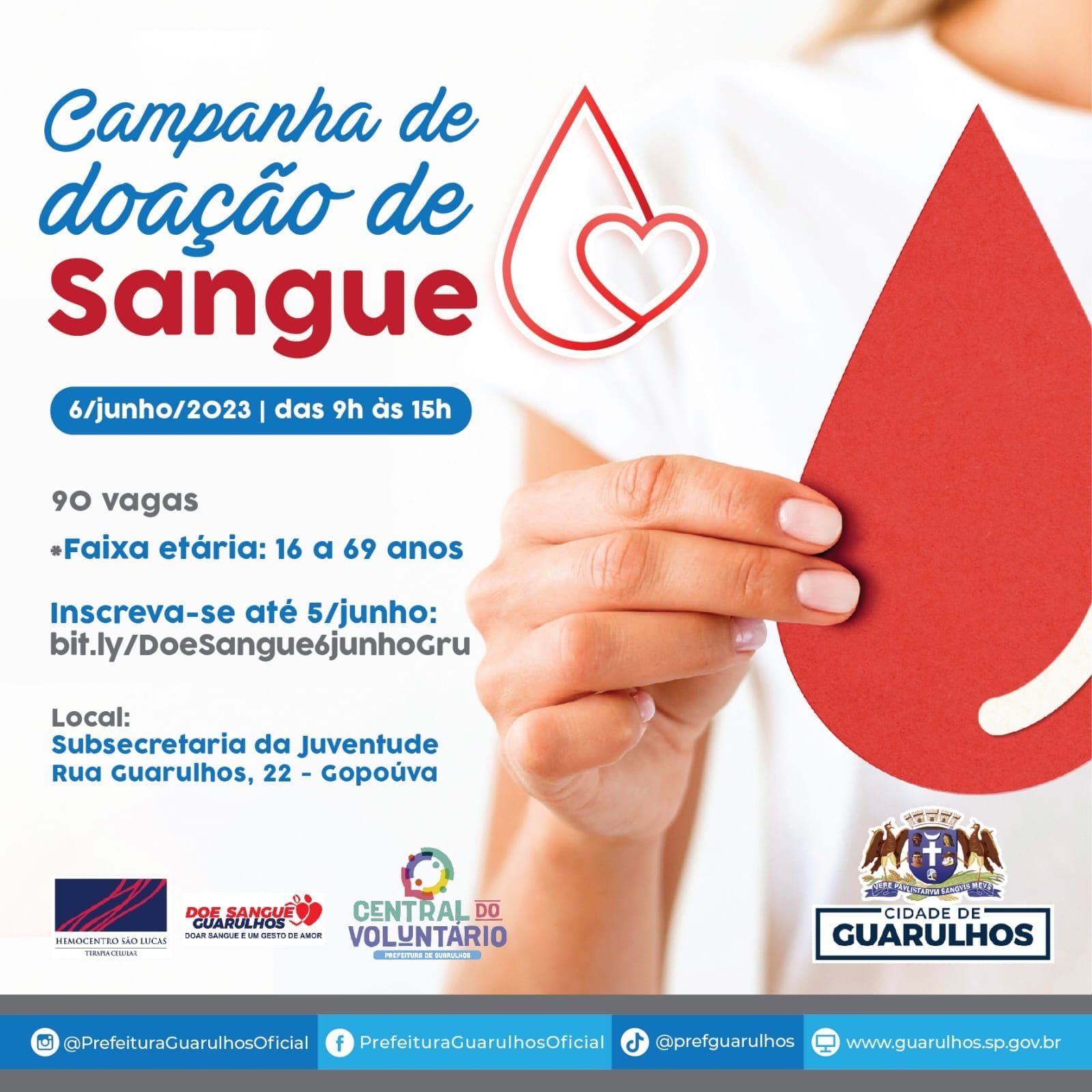 A Central do Voluntariado de Guarulhos (CVG) promove a campanha de doação de sangue no dia 6 de junho (terça-feira), das 9h às 15h, na Subsecretaria da Juventude (rua Guarulhos, 22, Gopoúva). São disponibilizadas 90 vagas e interessados em participar deverão fazer a inscrição pelo link bit.ly/DoeSangue6junhoGru até 5 de junho.