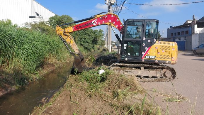 A equipe responsável conta com o auxílio de uma escavadeira hidráulica e, até o momento, já removeu 480 metros cúbicos de detritos do leito da vala. Além do desassoreamento, estão sendo realizados a limpeza e o alargamento das margens para otimizar o escoamento. O objetivo principal da intervenção é melhorar a fluidez e a capacidade de vazão do sistema, prevenindo a ocorrência de alagamentos na região.