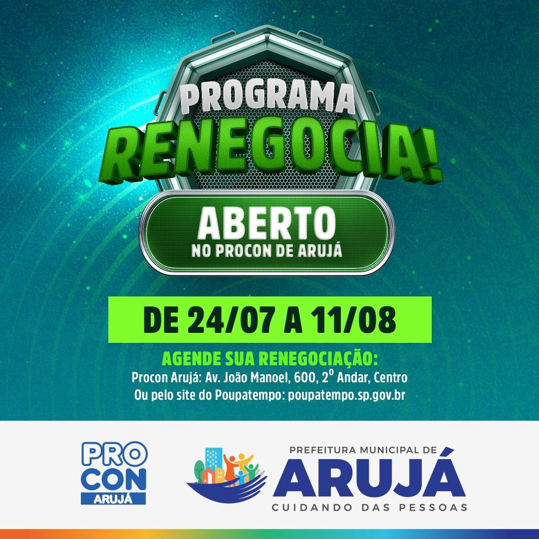 Precisa acertar dívidas com mais facilidade para caber no seu bolso? Aproveite o Programa Renegocia!, promovido pelo Procon Municipal de Arujá. De 24 de julho a 11 de agosto, você pode resolver pendências e evitar o superendividamento. Todo tipo de dívida pode ser negociada, com exceção de contratos de crédito com garantia real, financiamentos imobiliários e crédito rural.