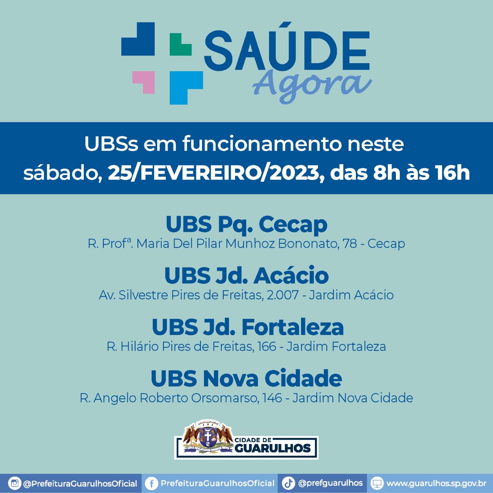 Neste sábado (25) todas as regiões de saúde (Centro, Cantareira, São João e Pimentas) serão contempladas com a abertura de uma Unidade Básica de Saúde (UBS) para atender os munícipes. As unidades são Parque Cecap, Jardim Acácio, Jardim Fortaleza e Nova Cidade, que receberão a população das 8h às 16h pelo programa Saúde Agora.
