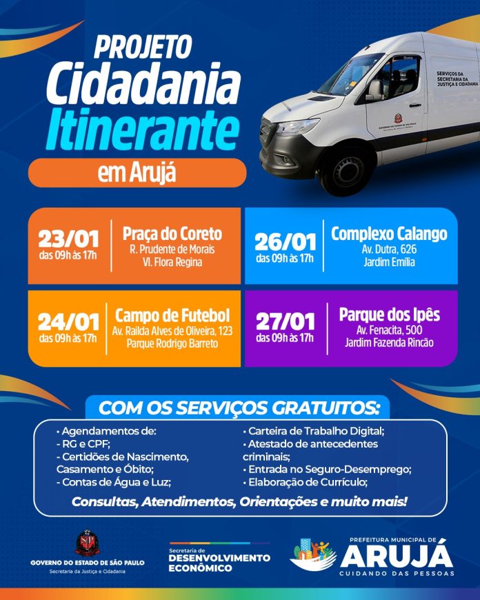 O Projeto Cidadania Itinerante, realizado pela Secretaria da Justiça e Cidadania, com o apoio da Prefeitura de Arujá, por meio da Secretaria Municipal de Desenvolvimento Econômico, passará por diversos pontos da cidade entre os dias 23, 24, 26 e 27 de janeiro. A unidade móvel, do Estado de São Paulo, levará diversos serviços públicos gratuitos para a população, como: agendamento de RG, CPF, Certidões de Nascimento, Casamento e Óbito, Contas de Água e Luz, Carteira de Trabalho Digital, Atestado de antecedentes criminais, entrada no Seguro-Desemprego, elaboração de currículo, entre outros atendimentos.