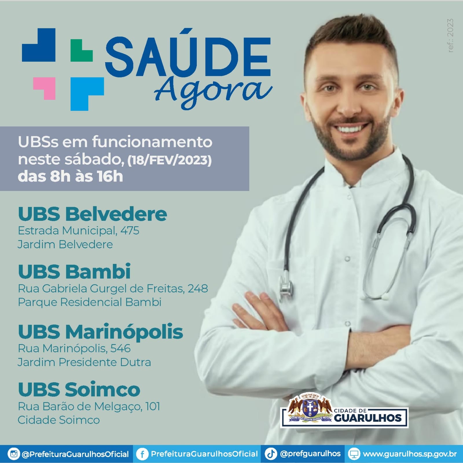 Neste sábado (18) a Prefeitura de Guarulhos abrirá quatro Unidades Básicas de Saúde (UBS) para atender os munícipes que pretendem aproveitar a data para se cuidar. As unidades são Belvedere, Bambi, Marinópolis e Soimco, que estarão em funcionamento pelo programa Saúde Agora das 8h às 16h.