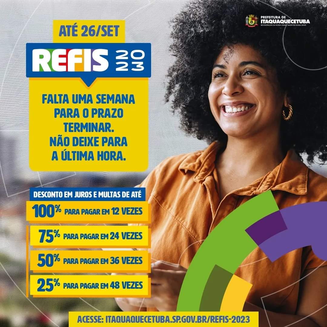 Se ainda não aderiu ao Refis, vem com a gente antes que o prazo termine. Você tem apenas uma semana para aproveitar as melhores condições com até 100% de desconto em juros e multas. Então bora nessa? Vai até o dia 26!