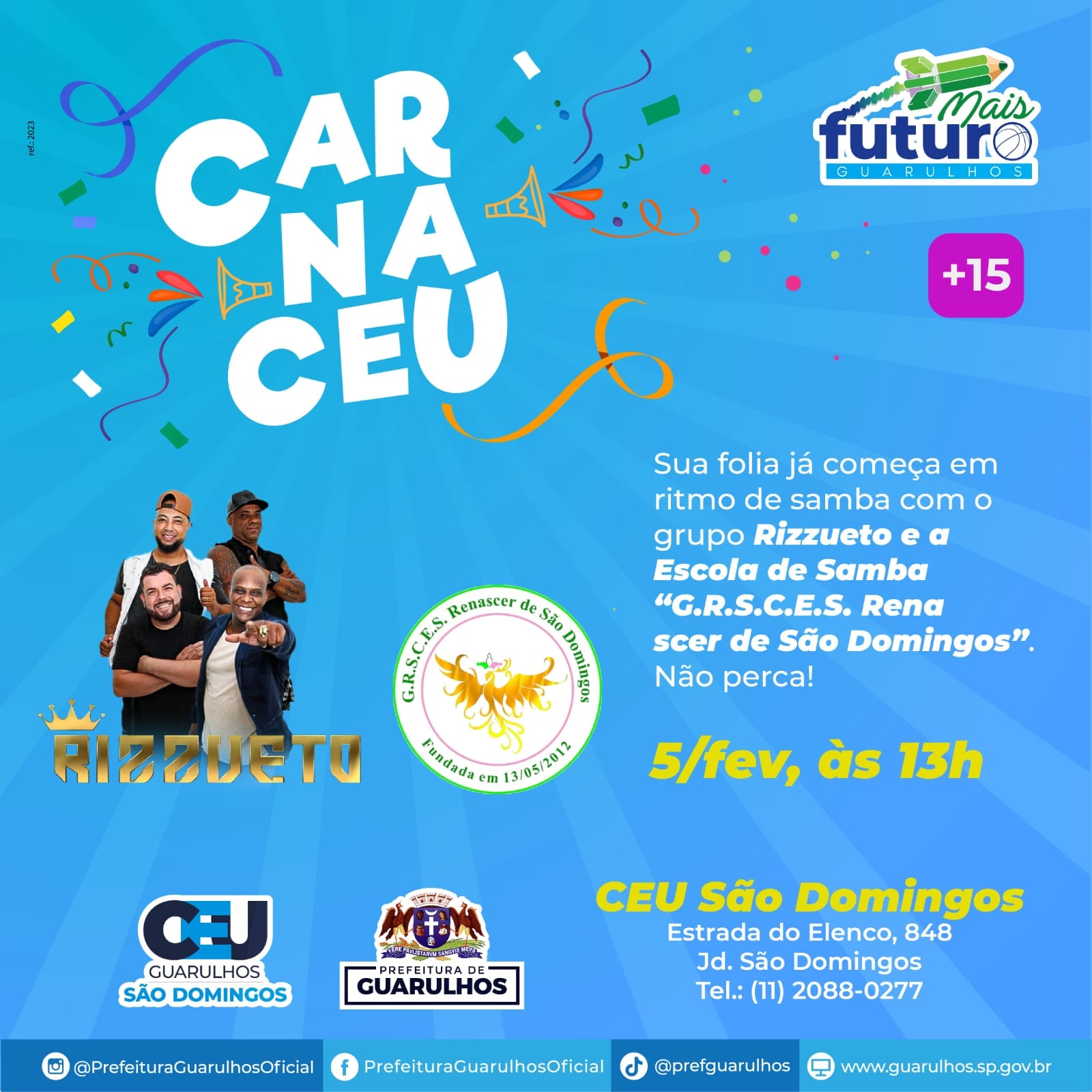 Os festejos do Carnaval 2023 em Guarulhos começam neste final de semana em ritmo de samba com o grupo Rizzueto e a escola de samba Renascer de São Domingos, que se apresentarão na quadra poliesportiva do CEU São Domingos no próximo domingo (5) a partir das 13h. A entrada é gratuita e a classificação indicativa é de 15 anos.