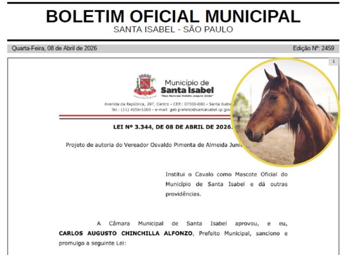 O prefeito de Santa Isabel, Carlos Chinchilla, sancionou nesta quarta-feira (8) a Lei nº 3.344/2026, que institui oficialmente o cavalo como o mascote oficial do município. A nova legislação, de autoria do vereador Osvaldo Pimenta de Almeida Junior, foi publicada no Diário Oficial e define o animal como símbolo representativo da cultura local, das tradições rurais e das festividades populares da cidade.