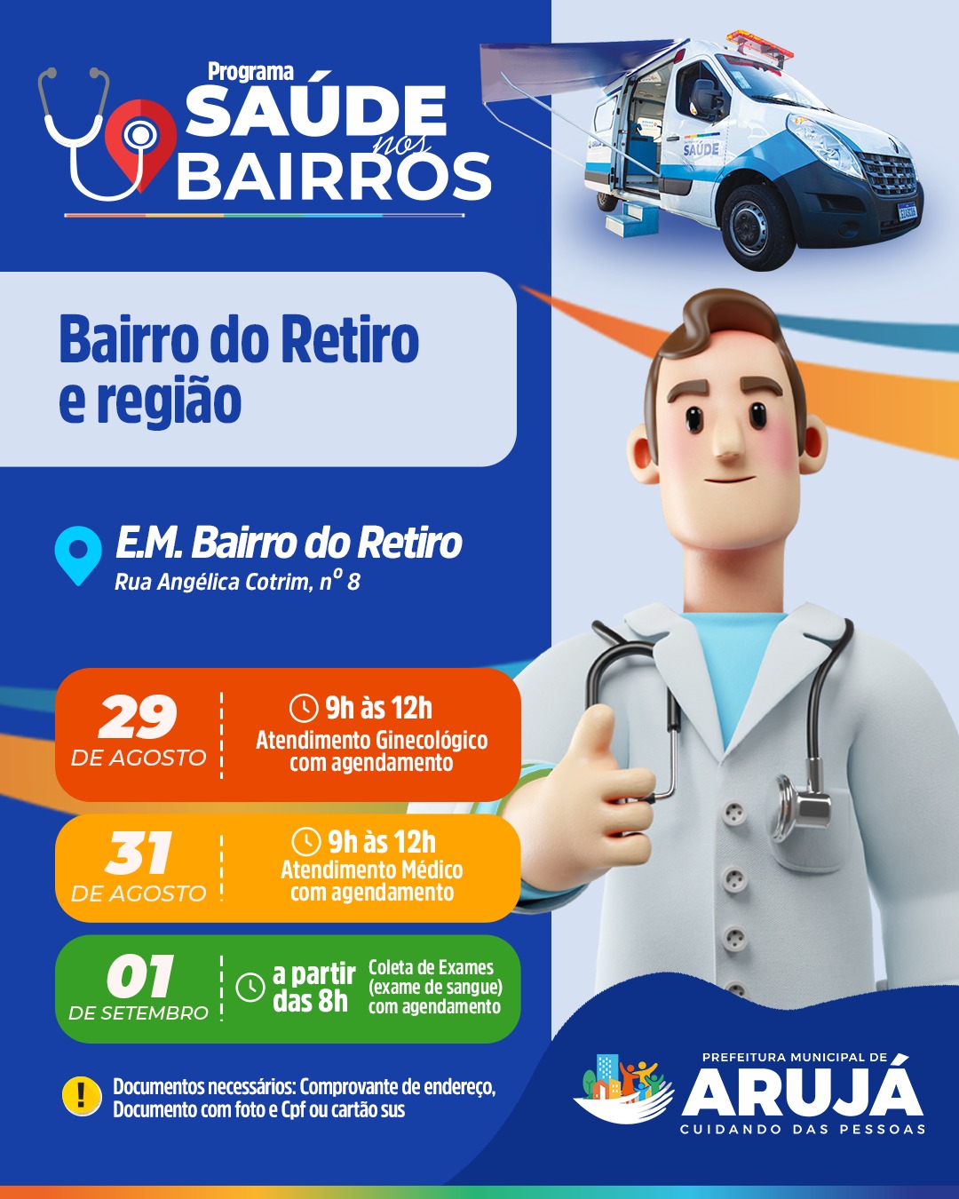 A Prefeitura de Arujá, pelas equipes da Saúde, dá andamento ao Programa Municipal Saúde nos Bairros, atendendo a população do Bairro do Retiro e adjacências, nos dias 29 e 31 de agosto e 1º de setembro. A unidade móvel da Saúde ficará na Escola Municipal (EM) do Bairro do Retiro, localizada na Rua Angélica Cotrim, nº 8.