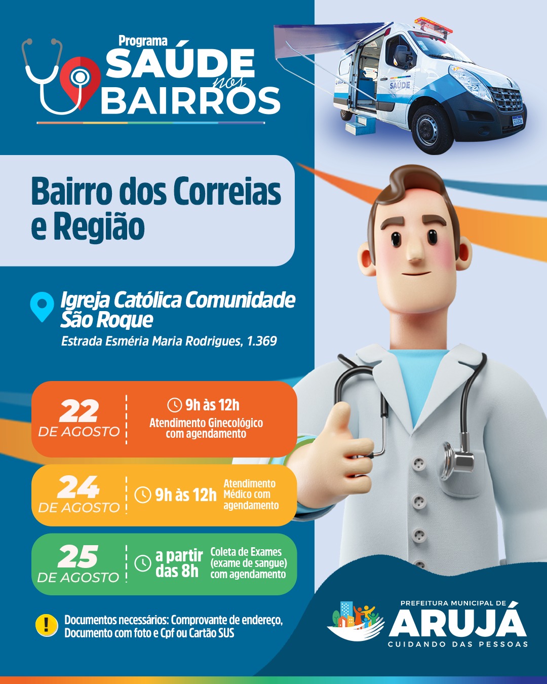 A Prefeitura de Arujá, pelas equipes da Saúde, dá andamento ao Programa Municipal Saúde nos Bairros, atendendo a população do Bairro dos Correias e adjacências, nos dias 22, 24 e 25 de agosto. A unidade móvel da Saúde ficará na Igreja Católica Comunidade São Roque, localizada na Estrada Esméria Maria Rodrigues, 1.369.