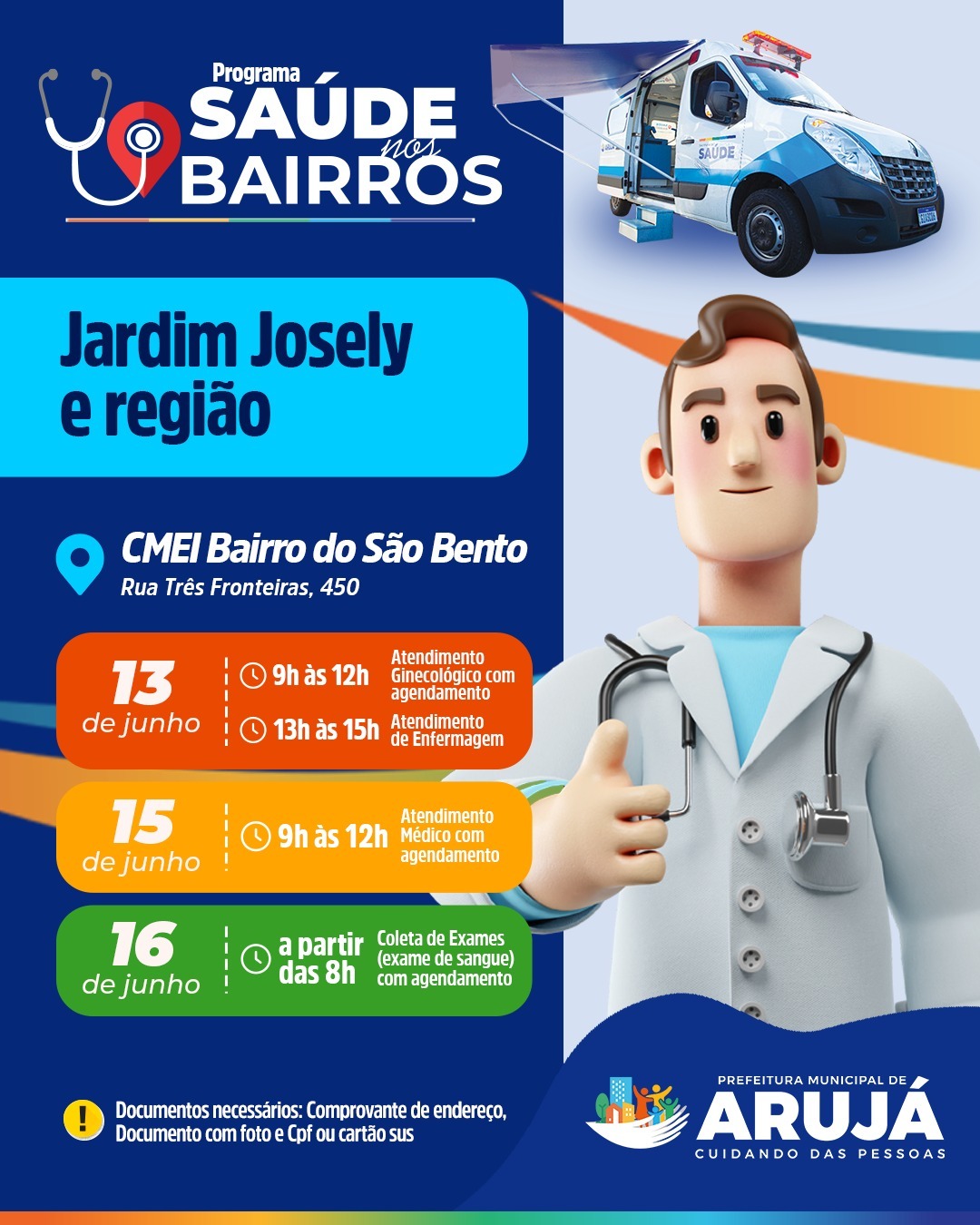 A Prefeitura de Arujá, pelas equipes da Saúde, dá andamento ao Programa Municipal Saúde nos Bairros, atendendo a população do Jardim Josely e adjacências, nos dias 13, 15 e 16 de junho. A unidade móvel da Saúde ficará no CMEI Bairro do São Bento, localizado na Rua Três Fronteiras, 450.