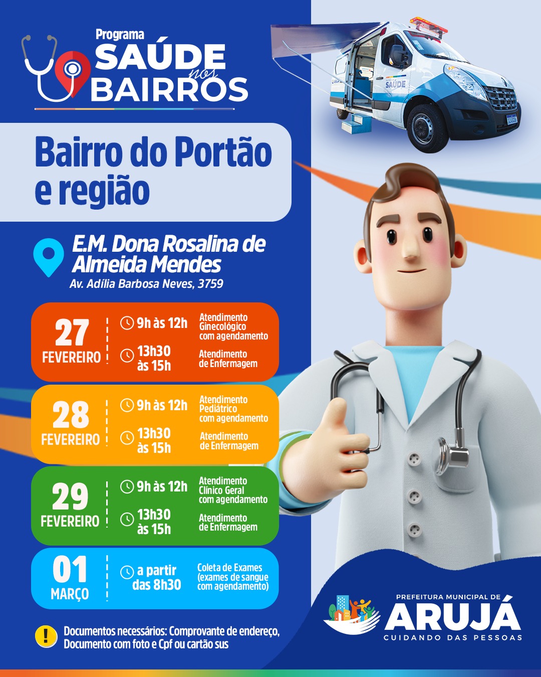 A Prefeitura de Arujá, pelas equipes da Saúde, dá andamento ao Programa Municipal Saúde nos Bairros, atendendo a população do bairro do Portão e adjacências, nos dias 27, 28 e 29 de fevereiro e 01 de março. A unidade móvel da Saúde ficará na Escola Municipal Dona Rosalina de Almeida Mendes, localizada na avenida Adília Barbosa Neves, nº 3759.