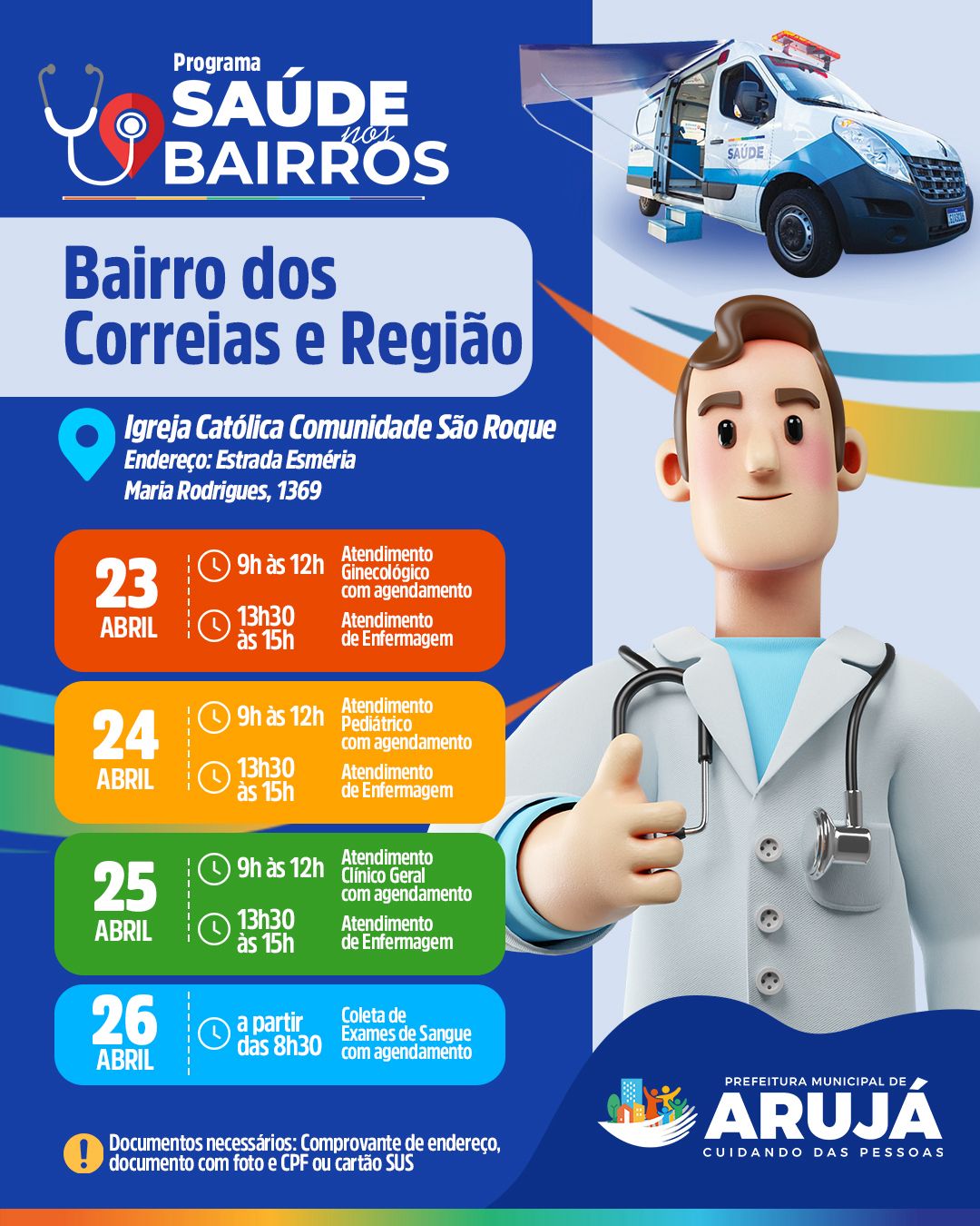 A Prefeitura de Arujá, pelas equipes da Saúde, dá andamento ao Programa Municipal Saúde nos Bairros, atendendo a população do bairro dos Correias e adjacências, nos dias 23, 24, 25 e 26 de abril. A unidade móvel da Saúde ficará na Igreja Católica Comunidade São Roque, localizada na Estrada Esméria Maria Rodrigues, 1369.