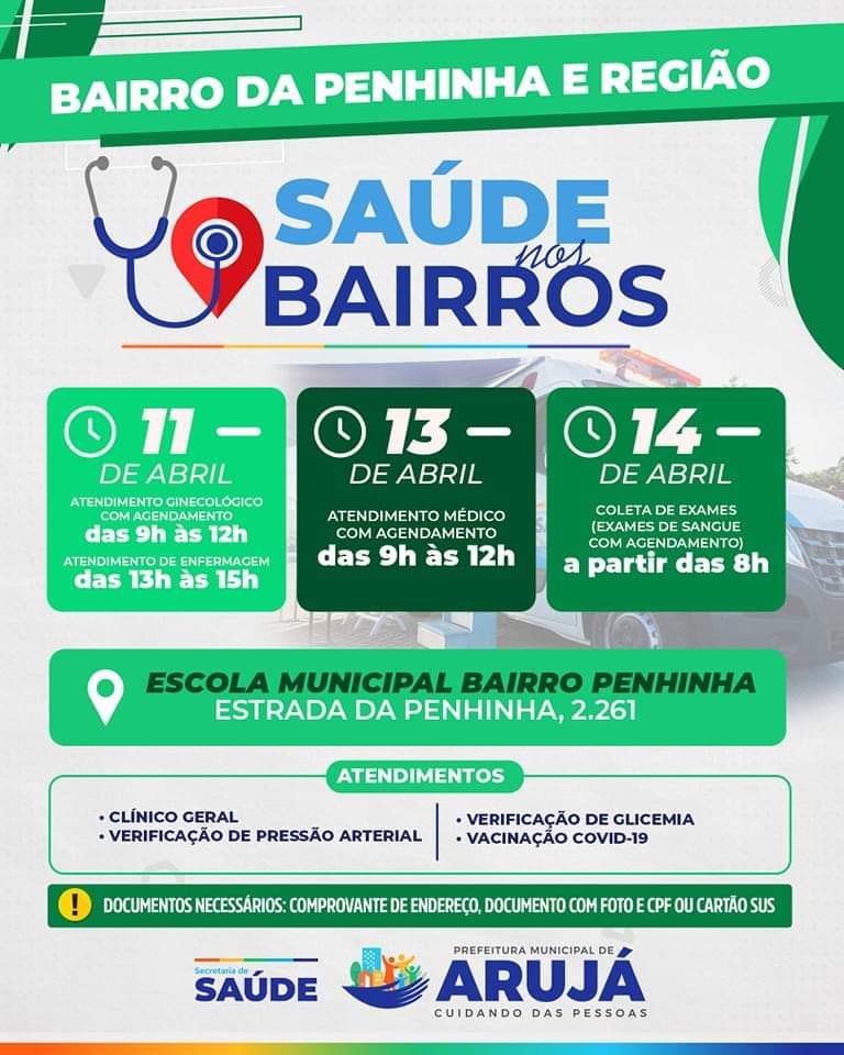 A unidade móvel da Saúde estará atendendo, por meio do Programa Municipal “Saúde nos Bairros”, no bairro da Penhinha nos dias 11, 13 e 14. A ação ocorrerá na Escola Municipal (E.M.) Bairro Penhinha, localizada na Estrada da Penhinha, 2.261.