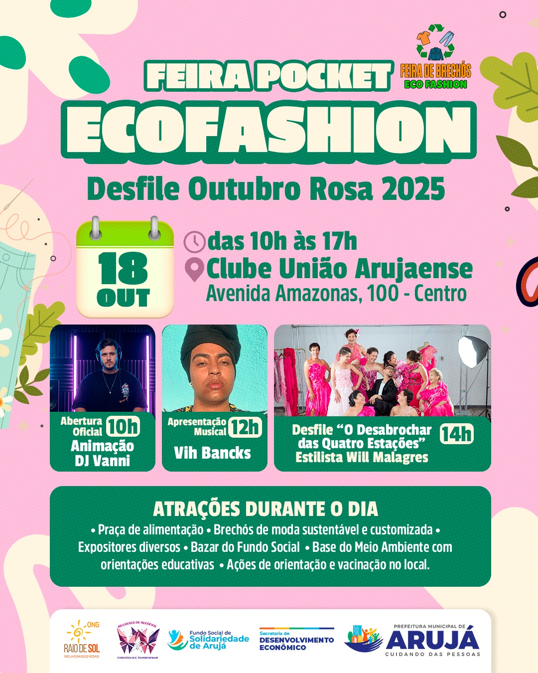 A programação, preparada pela Secretaria Municipal de Desenvolvimento Econômico, com o Fundo Social de Solidariedade de Arujá, inclui a abertura oficial às 10h com o DJ Vanni, seguida pela apresentação musical de Vih Bancks, às 12h. O desfile “O Desabrochar das Quatro Estações”, com as criações do estilista Will Malagres, ocorrerá às 14h.