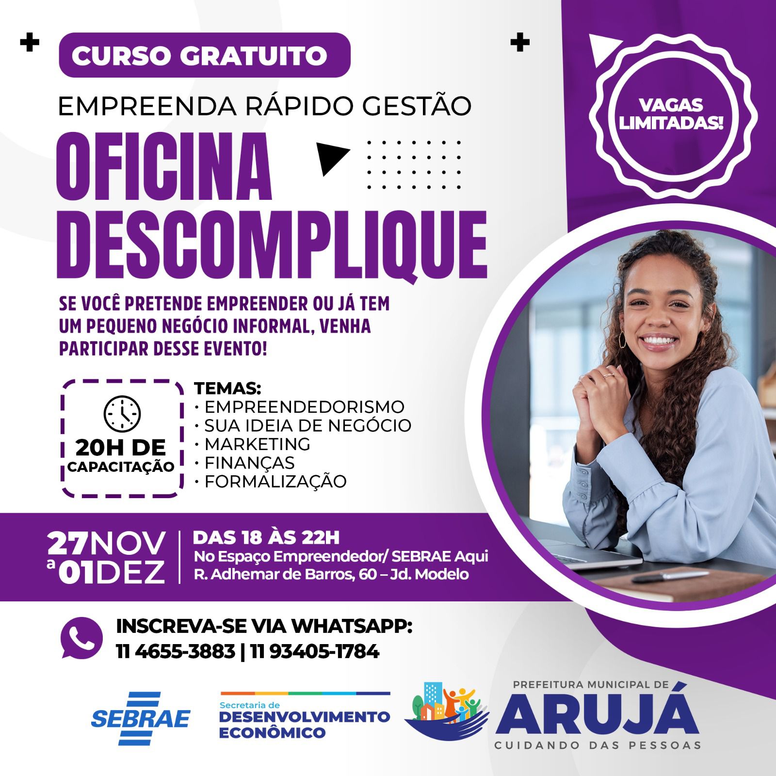 Uma grande oportunidade para quem deseja empreender! A Prefeitura de Arujá, por meio da Secretaria Municipal de Desenvolvimento Econômico, está com vagas abertas para a “Oficina Descomplique – Empreenda Rápido”, que acontecerá de 27 de novembro a 1° de dezembro, das 18 às 22h, no Espaço do Empreendedor, localizado na rua Adhemar de Barros, 60.