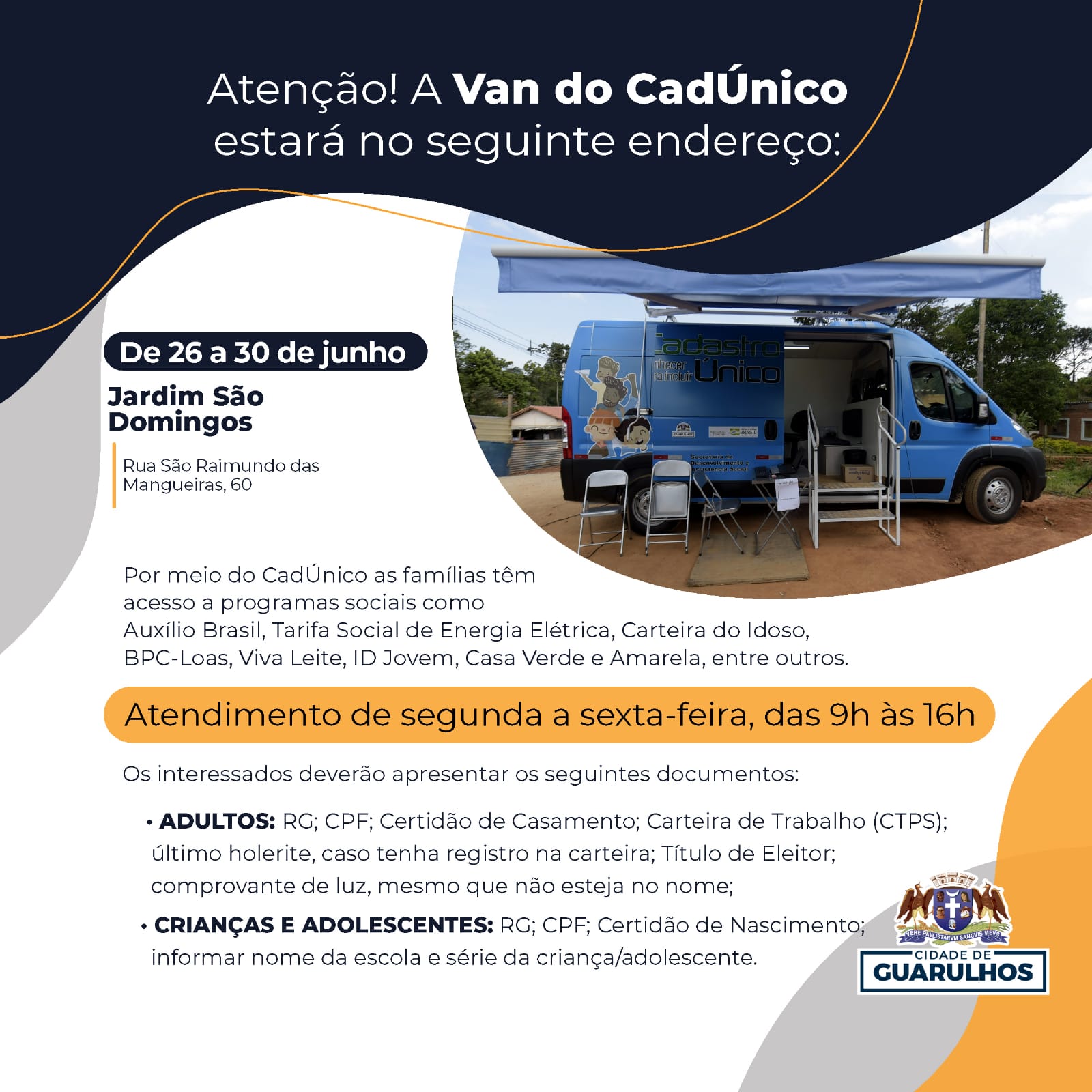 Entre os dias 26 e 30 de junho o Jardim São Domingos receberá a Van do CadÚnico. O equipamento de assistência social da Prefeitura de Guarulhos estará estacionado na rua São Raimundo das Mangueiras, 60, e receberá a população das 9h às 16h.