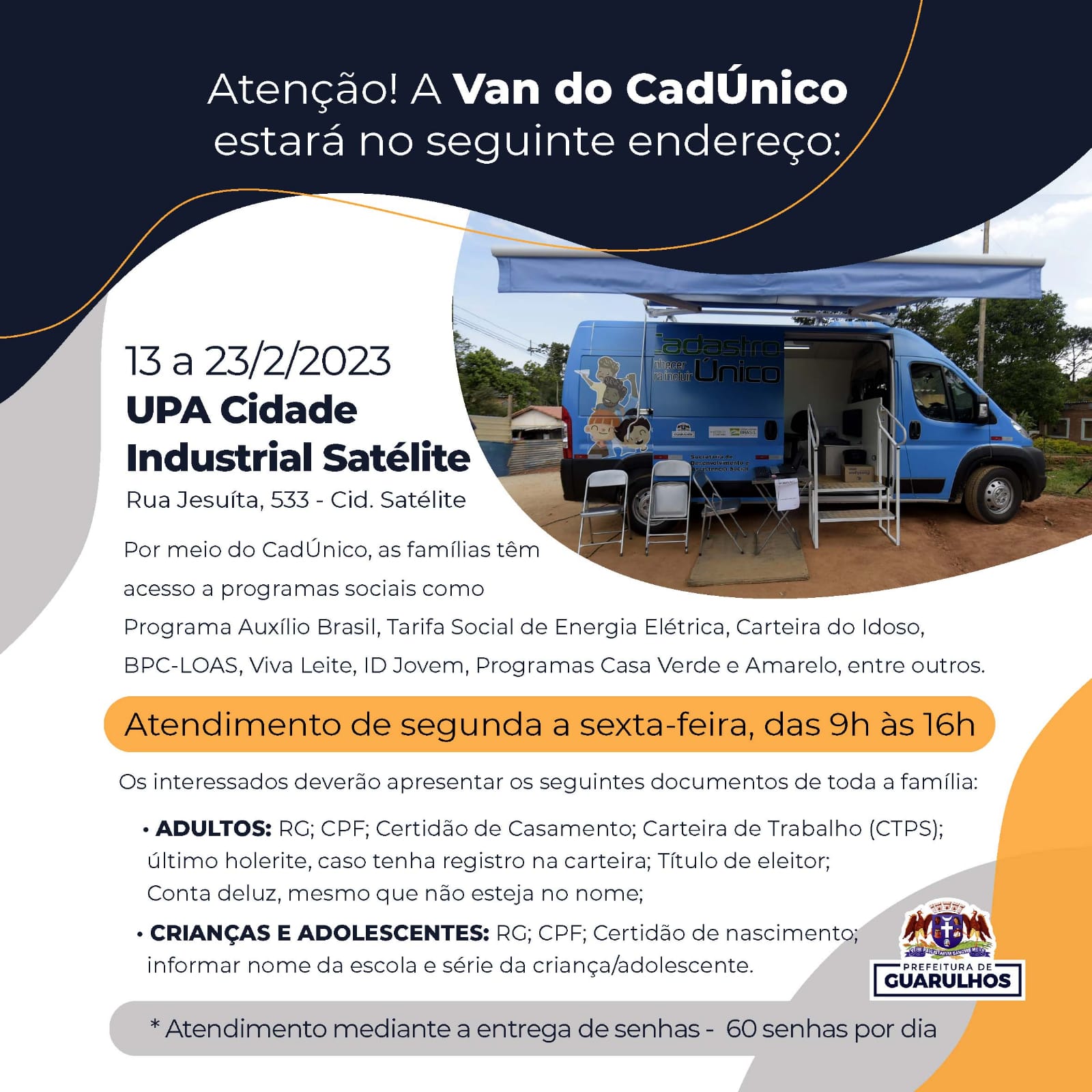 A Van do CadÚnico atenderá a população na UPA Cumbica, instalada na rua dos Jesuítas, 533, entre os dias 13 (segunda-feira) e 23 de fevereiro. No local a população poderá buscar atendimento de segunda a sexta-feira, das 9h às 16h, sendo que diariamente serão entregues 60 senhas aos interessados.