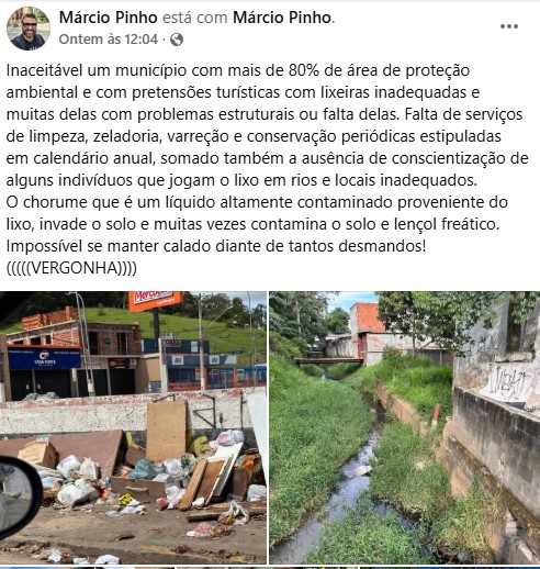 Na publicação, Pinho destacou a falta de serviços essenciais como varrição e conservação periódica, que deveriam seguir um calendário anual estipulado. Além das falhas na prestação de serviço público, o vereador apontou a falta de conscientização de parte da população, que realiza o descarte de lixo em rios e outros locais proibidos.